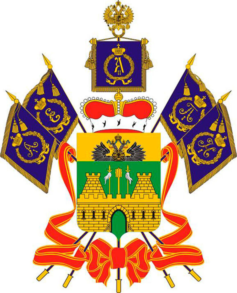 В зеленом щите золотая зубчатая стена, мурованная черным, с двумя такими же круглыми башнями и открытыми воротами. Между башен из-за стены выходят золотой пернач и по сторонам от него два серебряных бунчука, с золотыми остриями и на золотых древках. В золотой главе щита возникающий Российский императорский орел (черный двуглавый, с золотыми клювами и червлеными (красными) языками), увенчанный натуральными императорскими коронами, из которых средняя больше и имеет лазоревые (синие, голубые) ленты, несущий на груди Кавказский крест (крест с мечами «За службу на Кавказе»). Щит увенчан княжеской короной (шапкой), подложенной червленью. За щитом лазоревый (голубой) штандарт с золотым коронованным вензелем императора Александра II, окруженным лавровым венком; в навершии штандарта – венок и над ним Российский императорский орел. По сторонам за щитом накрест положены четыре лазоревых знамени с золотым изображением коронованных вензелей императрицы Екатерины II и императоров Павла I, Александра I и Николая I, окруженных такими же дубово-лавровыми венками. Древки штандарта и знамен лазоревые, навершия, кисти на шнурах и бахрома штандарта, знамен и подтоки золотые. Древки штандарта и знамен перевиты двумя лентами орденов Ленина, соединенными под щитом бантом.